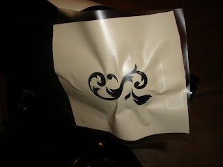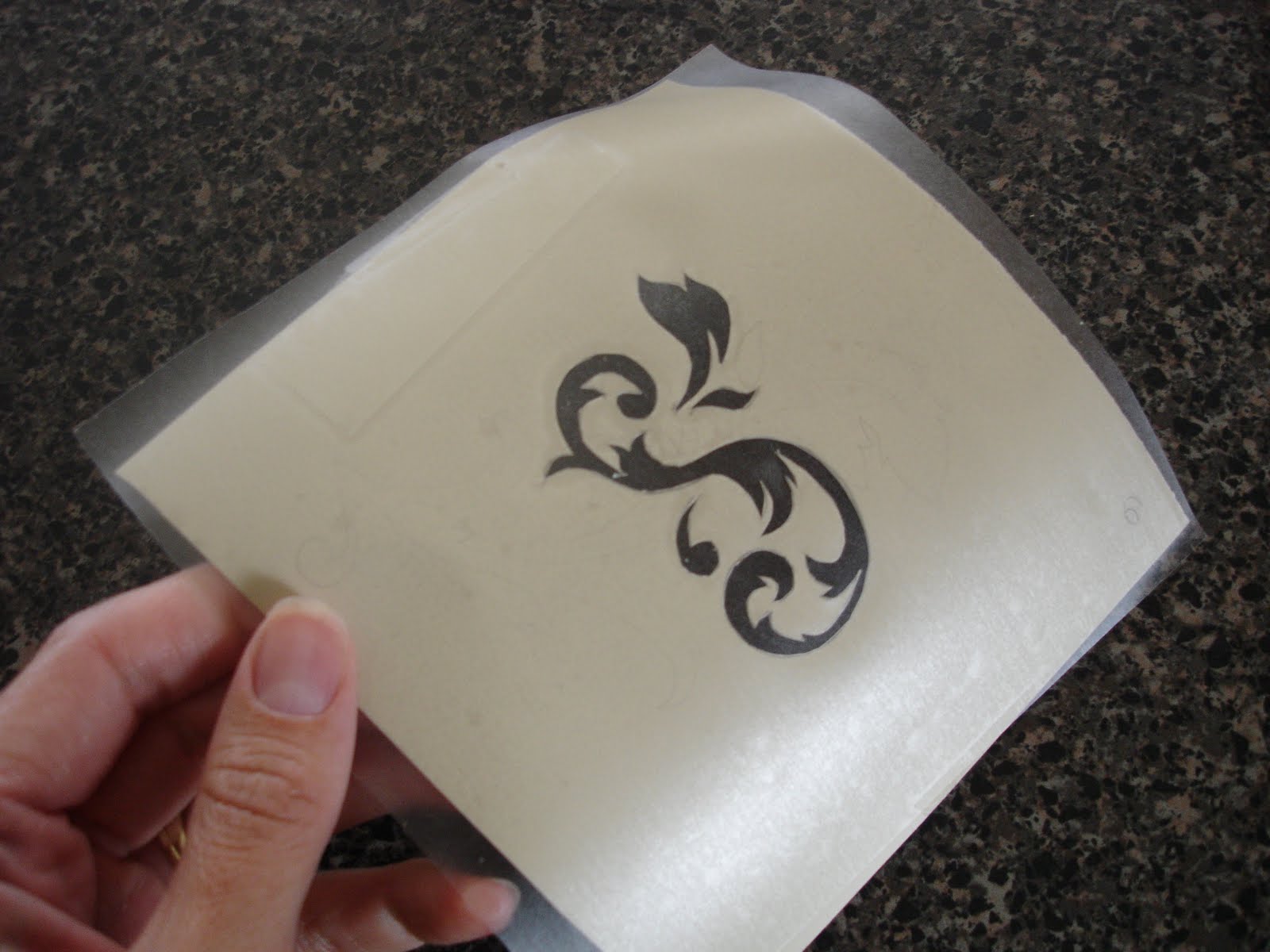 I found a design I liked on a piece of scrapbook paper from Hobby Lobby. I cut out a small piece of vinyl and taped them both on my window so that I could trace the design onto my vinyl. (the light from the window makes it possible to see through your vinyl)