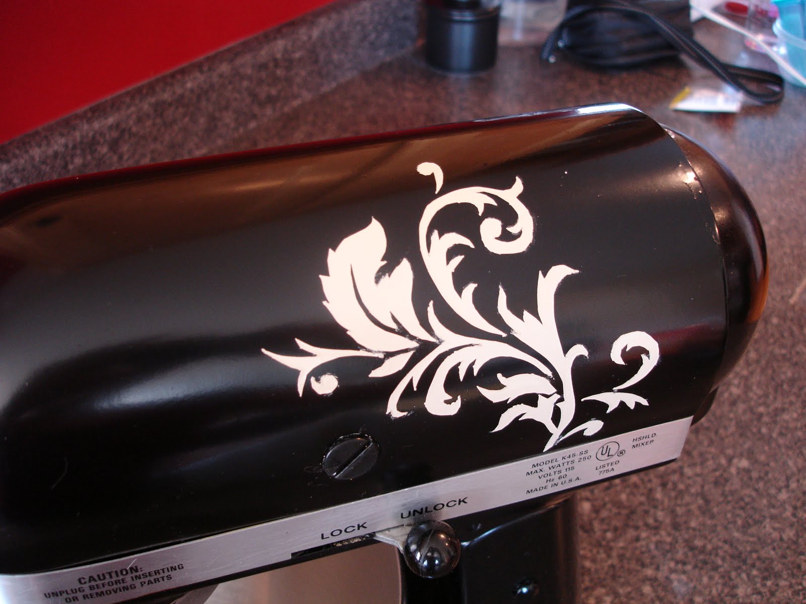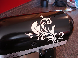 This is most excellent! I love the new look for your Kitchenaid and the stencil is gorgeous! This could be done on other appliances, too, now you've got my mind a workin'. Great project!